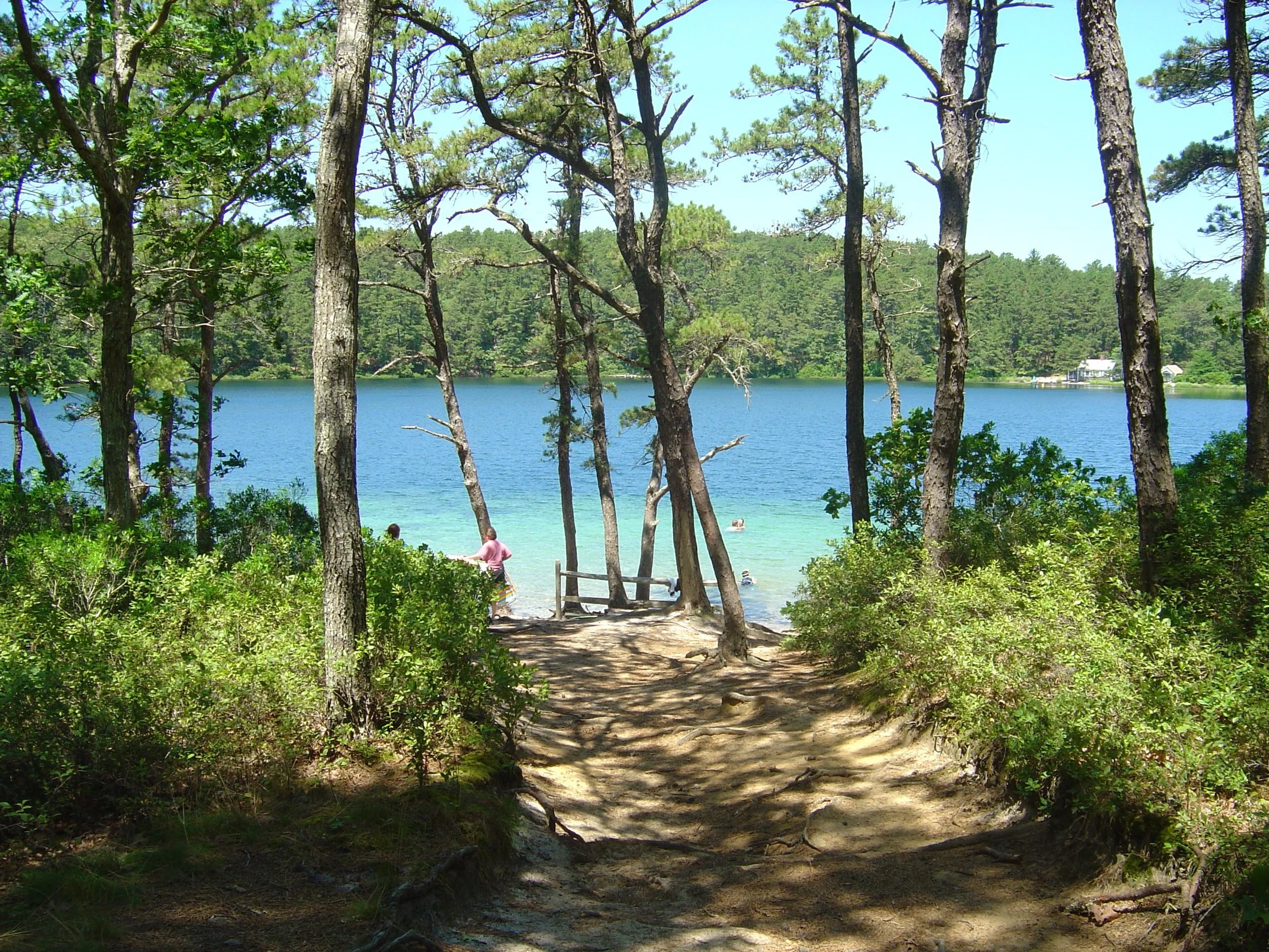 This pond is a little off the beaten path. Your best bet is to park at Long Pond parking area (Wellfleet parking sticker required) and then walk about 10 minutes. You walk across the street past the long pond picnic area and take the first road on your left, called Forest Road. At the end of Forest road stay straight and you will eventually see Dyer pond to your right. Dyer pond is quiet with a small beach area and a rope swing across from the beach that can be used to jump into the water.